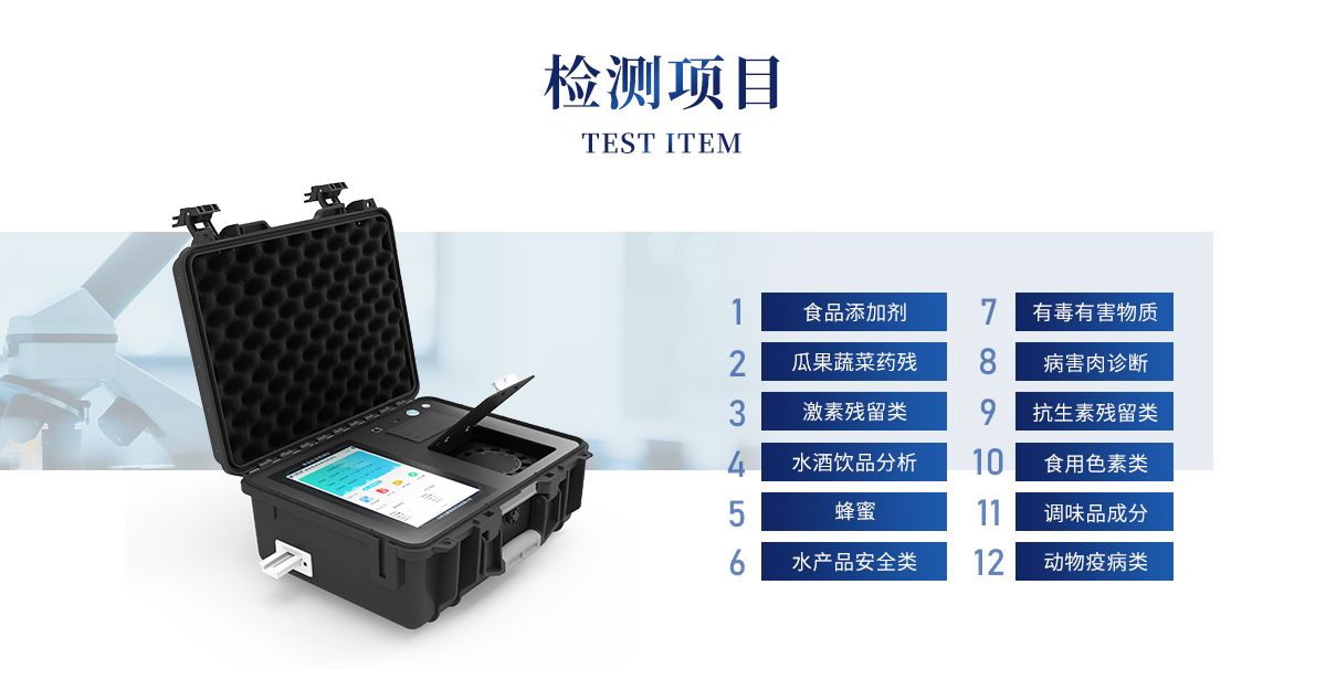 山東云唐智能科技有限公司生產的高智能食品安全檢測儀可快速檢測200多種食品安全項目,包含非食用化學物質、濫用食品添加劑、農藥殘留、獸藥殘留、重金屬、病害肉、營養強化劑、抗生素類殘留、激素類殘留、真菌毒素類殘留、化學類殘留等項目的定性定量檢測。