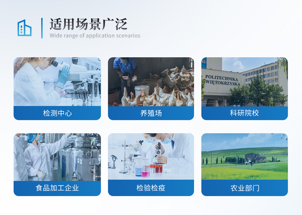 該儀器廣泛應用于食藥監局、衛生監督部門、農業部門、商業系統養殖場、屠宰場、食品肉產品深加工企業、畜牧獸醫、檢驗檢疫部門、食品生產企業、農副產品批發市場、農業生產基地、超市、餐廳、高教院校、食堂等單位部門對食品中的不安全指標進行監測使用。